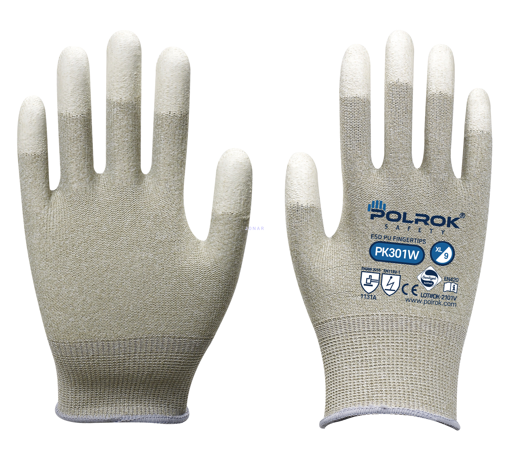 RĘKAWICE ESD PK 301 W SANITIZED Rękawice antystatyczne, nylonowe z włóknami miedzianymi, pokryte poliuretanem na końcówkach palców. Z powłoką antybakteryjną sanitized. Materiał: Nylon z włóknami miedzi, poliuretan Zastosowanie: Precyzyjny montaż wrażliwych elementów elektronicznych, ochrona przed wyładowaniami elektrostatycznymi. Praca w środowisku EPA. Pakowanie: 10 par w foliówce, 300 w kartonie Rozmiary: 6/S, 7/M, 8/L, 9/XL Model: PK 301 W Sanitized
