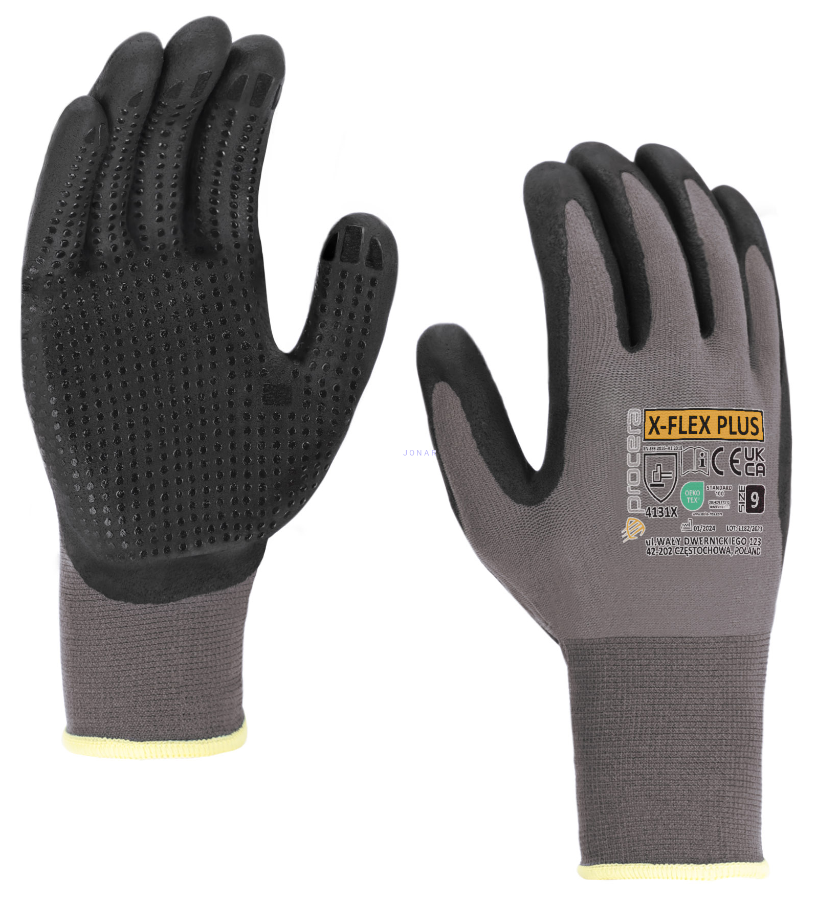- powlekane w części chwytnej spienionym nitrylem w kolorze czarnym oraz dodatkowym nakropieniem polepszającym chwytność.