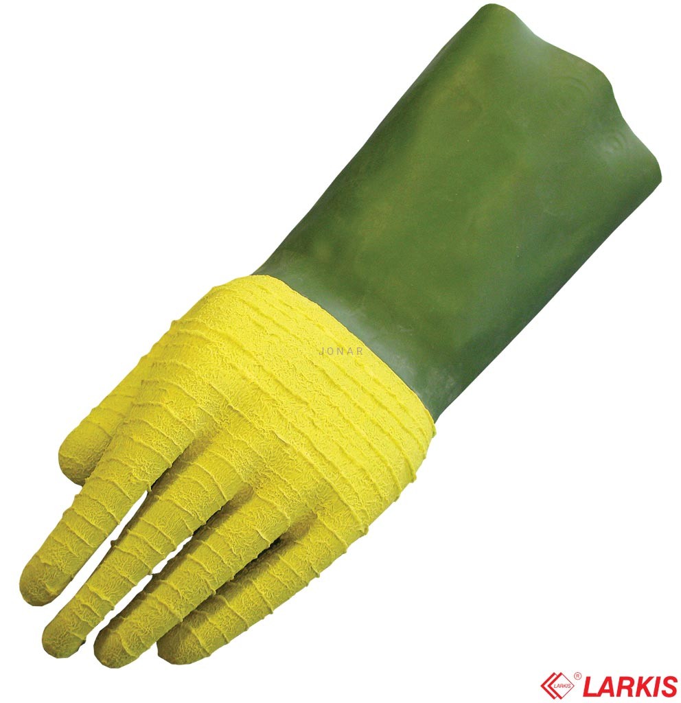 - rękawice dwuwarstwowe, co oznacza, że zostały podwójne maczane w mieszance lateksowej w kolorach zielonym i żółtym