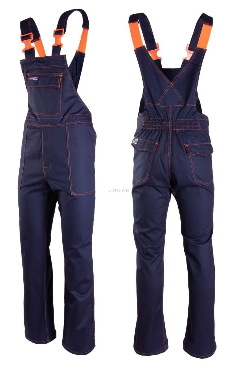 - spodnie na szelkach: wszyty klin w kroku zwiększający swobodę ruchów oraz komfort użytkownika, możliwość regulacji w pasie za pomocą guzików oraz gumki wszytej w tylnej części spodni, dwie kieszenie w tylnej części spodni, dwie boczne, kieszeń na miarkę „metrówkę”