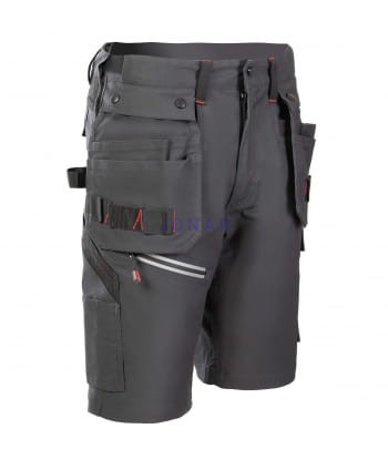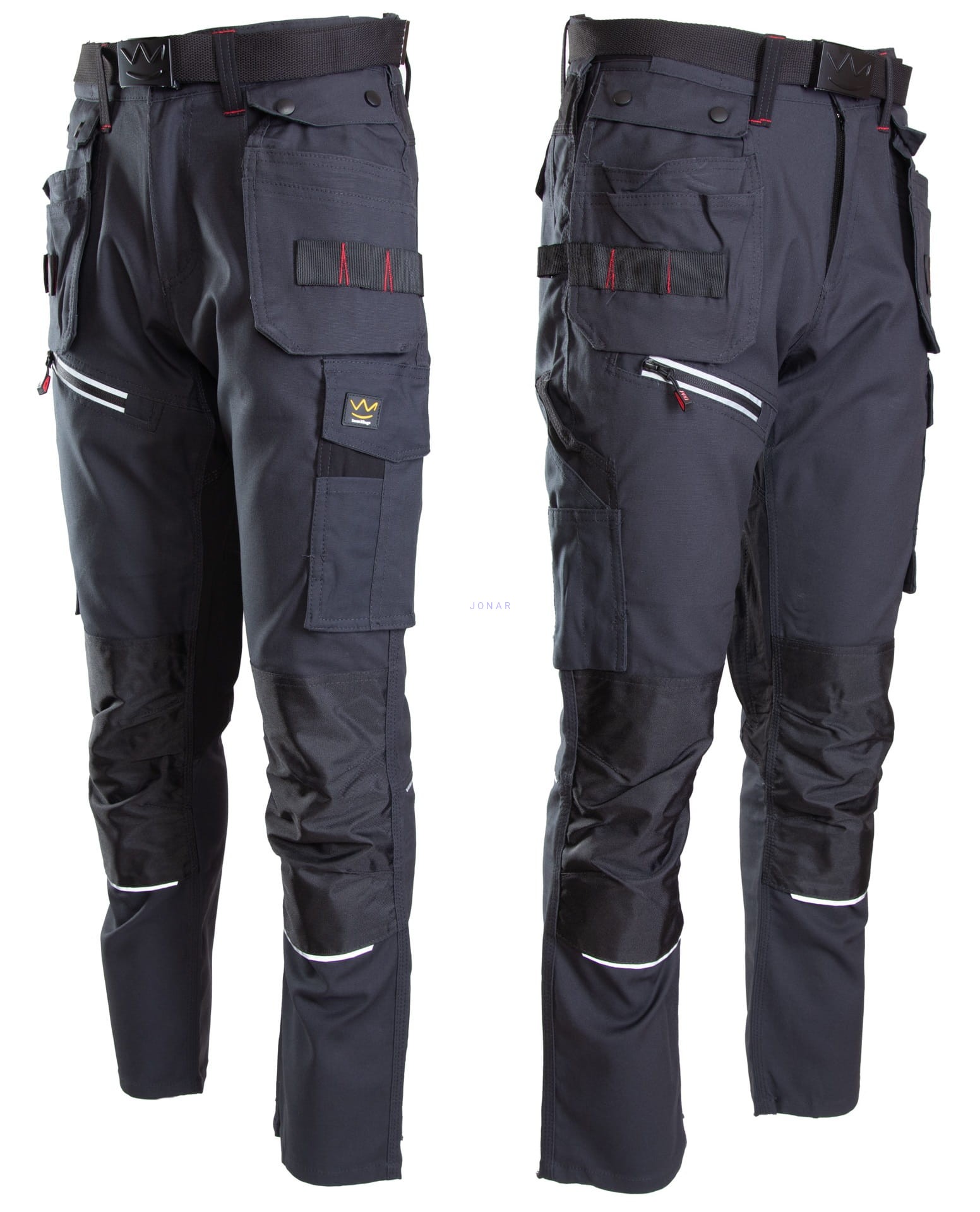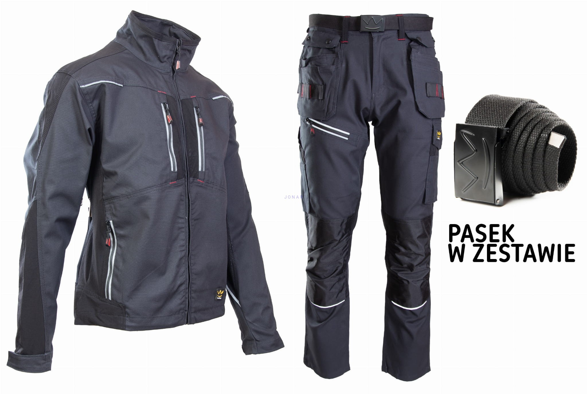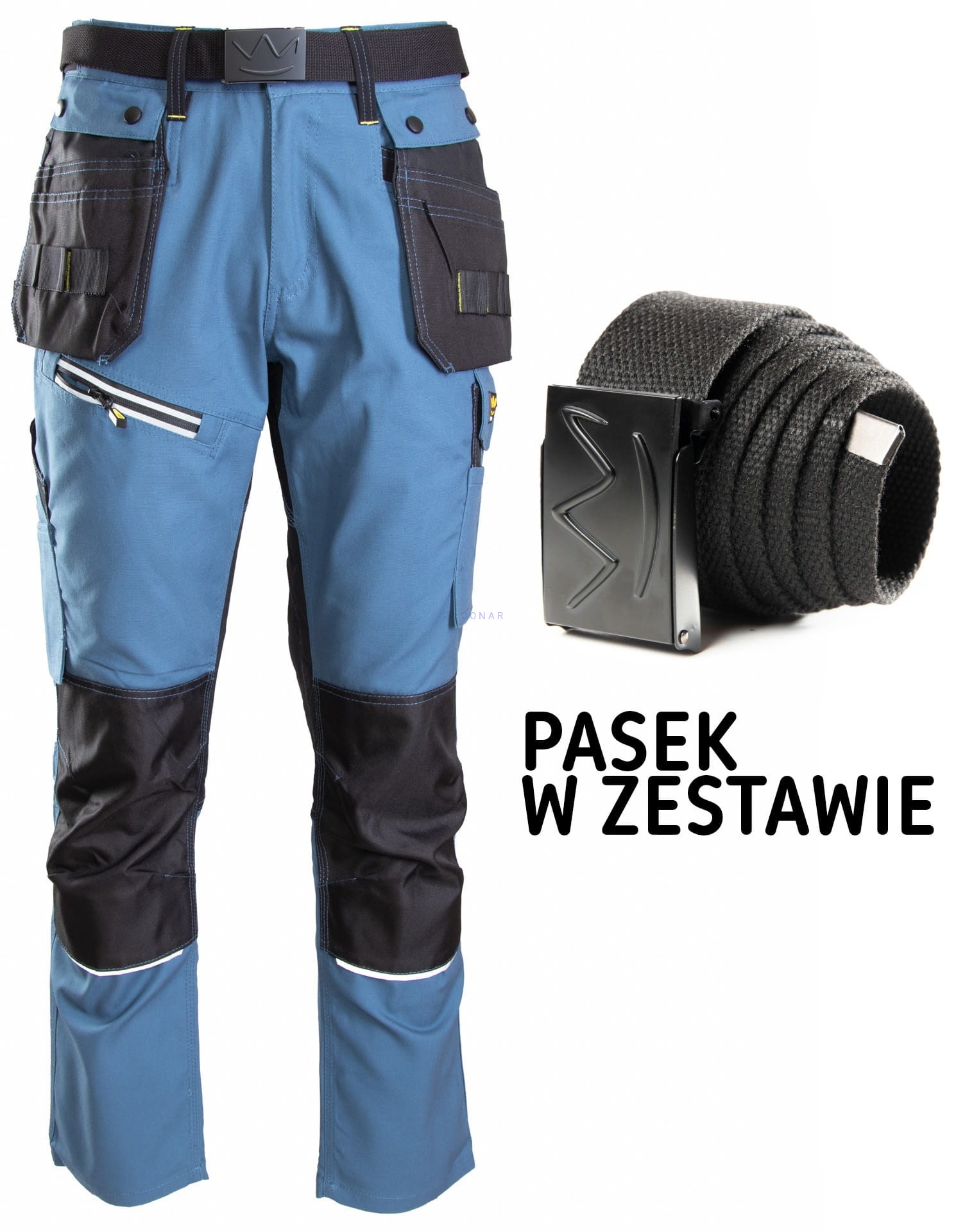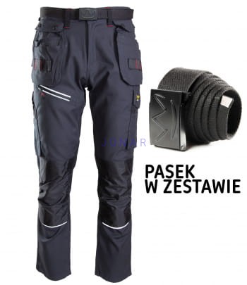 wiele kieszeni: na komórkę, na długopisy,na dokumenty, na miarkę „metrówkę”, zawieszka na identyfikator, dwie wzmocnione kieszenie boczne, dwie odpinane kieszenie monterskie,