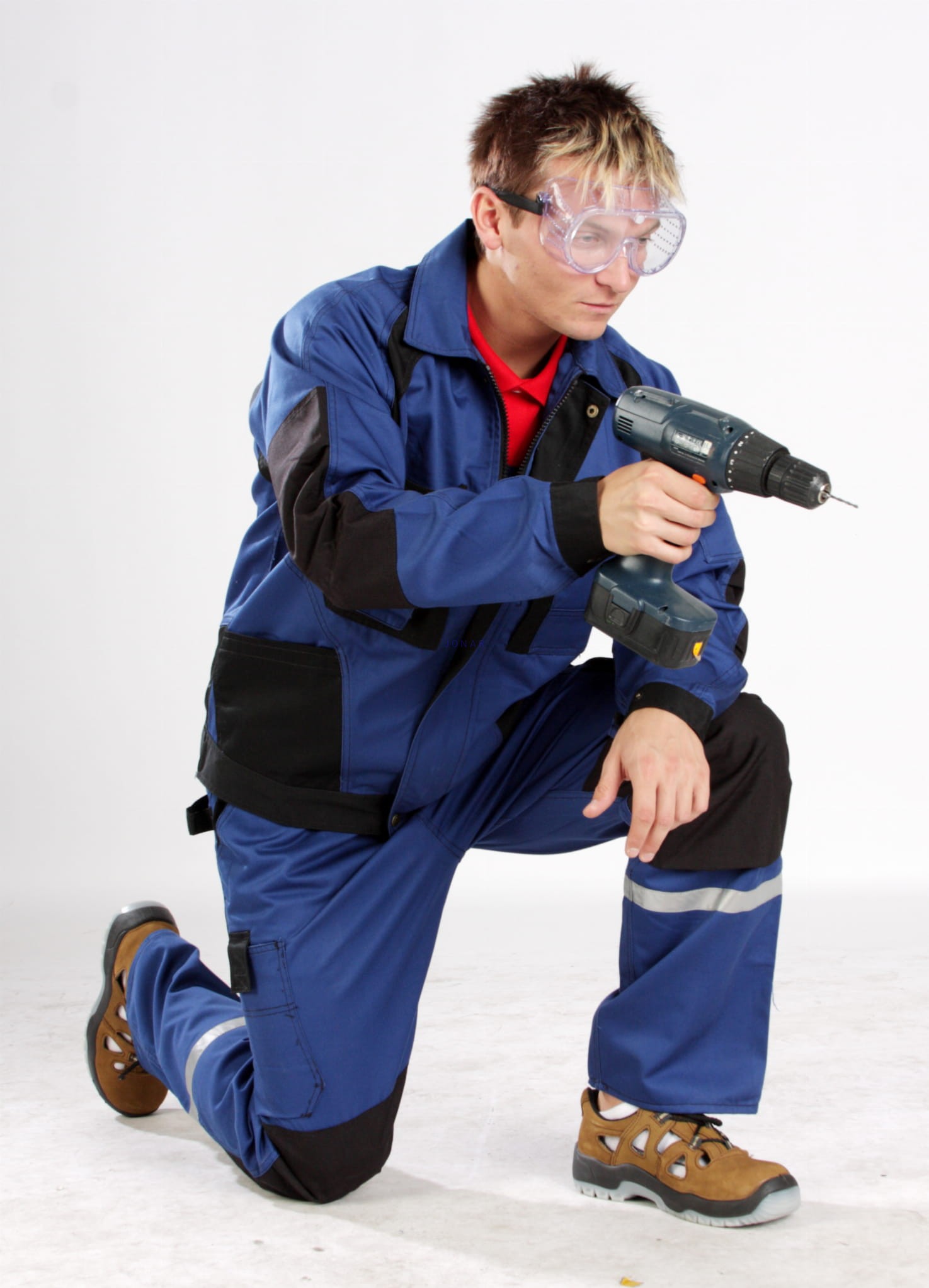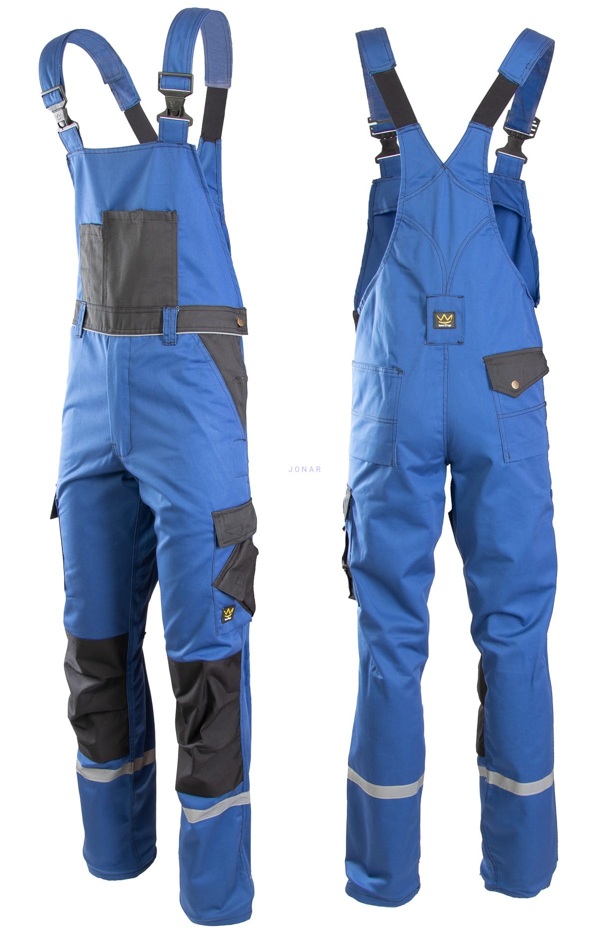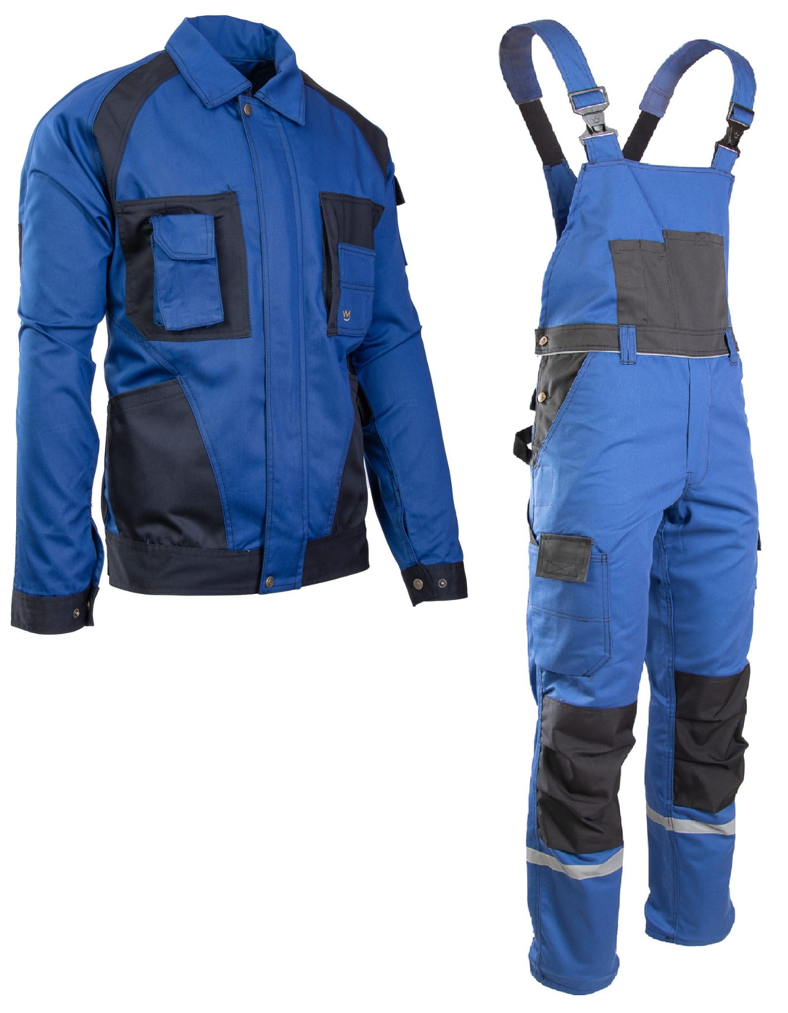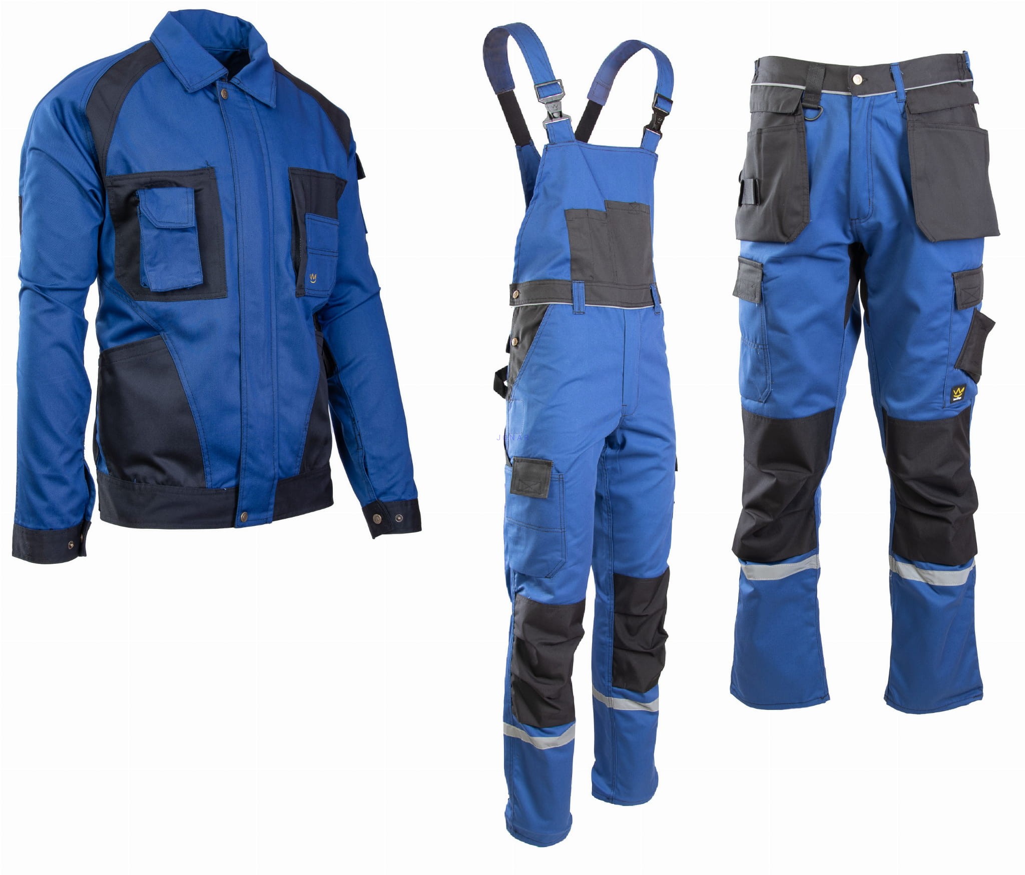 zapinana na zamek kryty listwą, która zapinana jest na rzepy, w mankietach wszyte gumki, na rękawie kieszonka na długopisy, górne kieszenie kryte listwą, zapinane na napy, kieszonka na długopis, transpiratory powietrza, na łokciach wzmocnienia z Cordury, elementy odblaskowe - spodnie na szelkach: długie, szerokie szelki, regulacja w pasie za pomocą guzików, wiele fukcjonalnych kiesznie, w tym na nakolanniki 9wykonana z Cordury), szlufka na młotek, szlufki na pasek, odblaskowe elementy na nogawkach